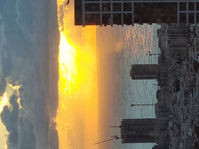 An aerial view captured at sunset over the Mediterranean Sea showcases a portion of the Tel-Aviv, Israel, cityscape. The horizon is dominated by a brilliant golden-orange sun, partially obscured by dark, scattered clouds, casting a luminous glow over the water. The sea itself appears textured, with ripples reflecting the light. In the midground, a dense urban environment unfolds. To the left, a tall, dark skyscraper is under construction, featuring two prominent tower cranes. Adjacent to it, another less complete multistory structure is visible, accompanied by a single, slender construction crane further inland. A finished high-rise building stands to the right of these construction sites. The lower levels of the city reveal numerous smaller, densely packed buildings, typical of an urban residential and commercial area. On the far right, a large, modern high-rise building with dark, reflective glass panels stands prominently, partially cropped by the frame. No discernible individuals or specific interactions are visible within the frame due to the distance of the shot. The scene captures an evening vista of coastal urban development.