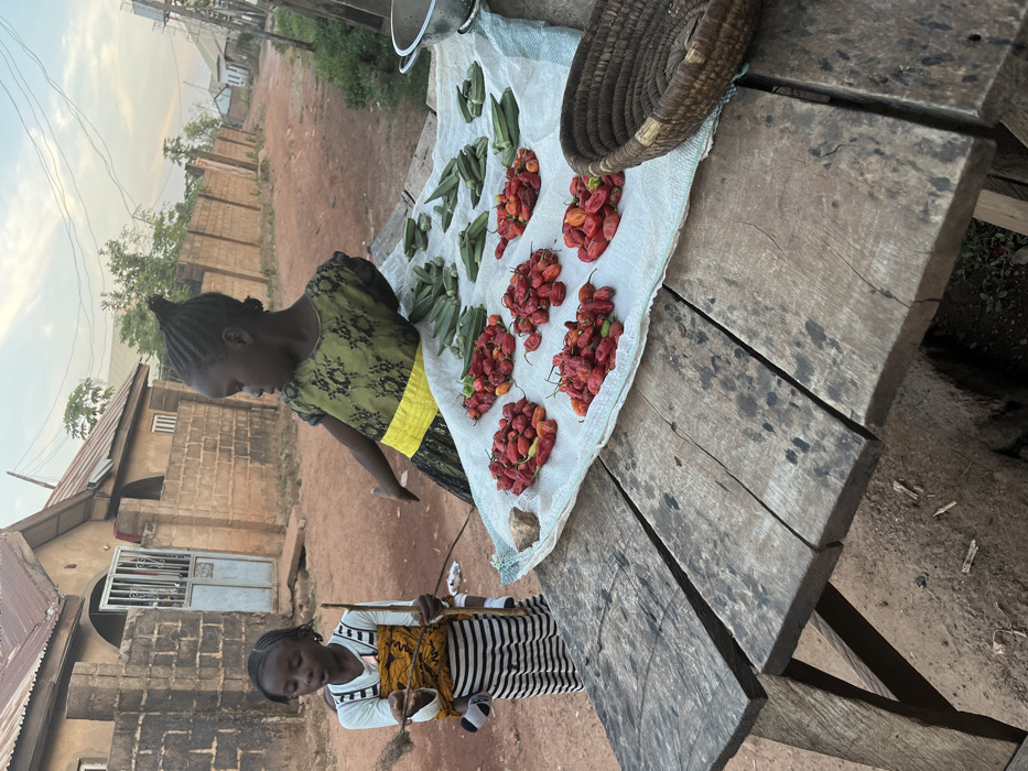 The image depicts an outdoor scene in the city of Rido, Nigeria. Two young Black females are positioned around a weathered wooden table serving as a market stall. In the foreground, a dark, aged wooden table is covered by a white woven sack. Arranged on the sack are six distinct piles of red, elongated peppers and multiple green okra pods. A small, light-colored stone rests on the sack near the peppers. To the right, a round, dark brown woven basket is visible on the table, along with a partially obscured silver-colored metal bowl. To the left of the table stands a young female with dark braided hair, wearing a light long-sleeved top under a black and white striped garment. A patterned fabric is wrapped around her torso, securing what appears to be an infant or doll, evidenced by a small, white-socked foot. She holds a long, thin stick in her left hand and a feathery, fibrous object in her right, directing her gaze downward at these items. To the right of the table, another young female, also with dark braided hair styled into a topknot, leans on the table. She wears a dark green dress with a black pattern and a yellow band at the waist. Her head is turned to her left, observing the area near the first girl. The background reveals a reddish-brown dirt road. Along the road, several single-story and possibly two-story buildings constructed of brick or concrete blocks with plaster are visible, featuring corrugated metal roofs. A light blue metal gate is prominent on a house to the left. A low brick wall borders properties. Sparse vegetation, trees, and faint utility lines against a light sky complete the environment. The scene is illuminated by diffused natural light, consistent with an overcast sky or late afternoon.