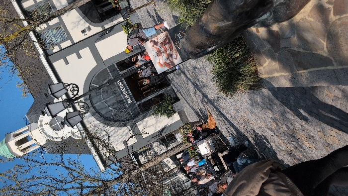 The image depicts an outdoor commercial area within the Designer Outlet Roermond, Netherlands, under a clear blue sky with strong sunlight casting distinct shadows. A prominent building, centrally located, features a large arched glass entrance with "BURBERRY" signage, constructed with light-toned walls and dark grey trim. To the left of this building, a white square tower topped with a light green dome is visible. The ground is paved with varying shades of grey cobblestones, and deciduous trees with bare branches line the area. A decorative black streetlamp with three lanterns stands in the mid-ground. Approximately two dozen individuals are present in the scene. Several people are gathered directly in front of the Burberry entrance, some appearing to queue. To the left, a group of individuals is seated at outdoor tables, and a brown dog lies on the paved ground nearby. In the mid-ground, a man wearing a grey top, blue shorts, and a yellow cap stands near a freestanding sign advertising pastries, positioned to the right of the Burberry entrance. A woman in a dark jacket and white shoes stands adjacent to this sign. Green shrubs are visible in planters, and a dark, indistinct object, possibly a statue base, occupies the lower right foreground.
