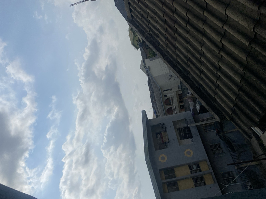 The image depicts an elevated, oblique view of a densely built residential area in Agege, Nigeria, under a partly cloudy daytime sky. In the immediate foreground, a weathered dark grey tiled roof, composed of corrugated sheets, occupies the lower right section of the frame, slanting upwards to the right. Beyond this roof, a multi-story light grey building with yellow circular decorative motifs on its facade is prominent on the left, featuring balconies and windows with visible security bars. Behind it and further into the mid-ground, multiple other multi-story residential structures with lighter-colored exteriors, some exhibiting arched balcony designs, are visible. Laundry is observed hanging on lines between these structures. A black water tank is partially discernible among the buildings. In the far background, additional rooftops and a green-painted building can be seen. A vertical metal rebar structure, indicating potential ongoing construction, protrudes from the top-right, behind the foreground roof. No individuals or explicit activities are visible within the frame.
