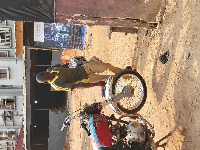 An older man in a green and yellow shirt leans against a wall outdoors, next to a vintage red and silver motorcycle. He looks away from the camera. Behind him, a building with multiple windows is visible, as well as a sign that reads "Welcome to." The ground is sandy and scattered with debris. The scene appears to be taken during daylight.