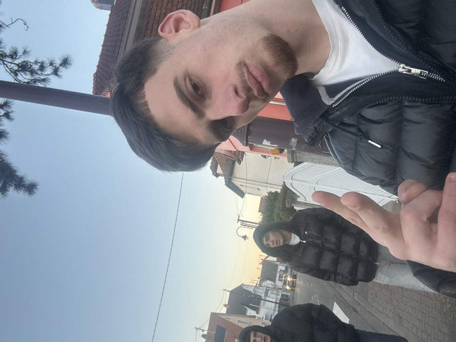 The image depicts three males on a residential street in Ostwald, France, during daylight hours, likely late afternoon. The foreground shows a male with short, dark hair and light facial hair, wearing a black puffer jacket over a white t-shirt, looking directly at the camera. His right hand is raised, forming a gesture with the thumb and index finger extended, and middle and ring fingers bent. To his left, in the midground, two other males walk down the street. The first of these, on the left, is partially visible, wearing a black puffer jacket with a hood, looking left. The second, in the center, has long dark hair and wears a black puffer jacket with the hood up, looking right. In the background, a paved street is visible with residential houses featuring pitched roofs on both sides. A light-colored car with headlights on is driving away in the distance. A utility pole with pine branches is visible on the right side of the frame. The sky is clear and light blue. A white gate or fence is visible to the right of the central male.