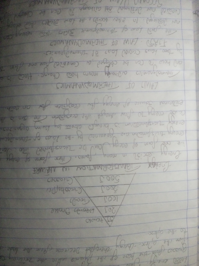 This image shows notes on energy transformation and the laws of thermodynamics. An energy pyramid displays the flow of energy through an ecosystem, with grasses at the base and hawks at the apex. The notes discuss that energy exists in many forms and can be transformed. The laws of thermodynamics govern these transformations, particularly focusing on heat change. The first law of thermodynamics states that energy cannot be created nor destroyed, only changed from one form to another.