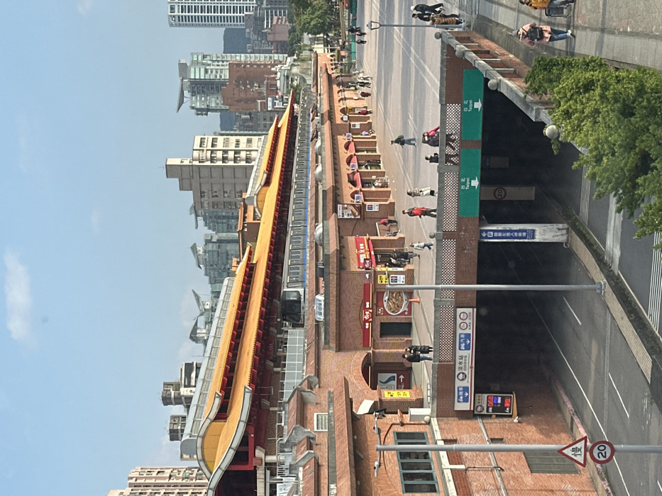A long, traditional building with a yellow tiled roof stands alongside a busy street. The architectural style is reminiscent of a Chinese temple. The street is bustling with people and vehicles. A tunnel entrance is visible on the right, marked with signs directing to "Taipei." The building appears to be a train station, evident from the train visible in the background and station signage. The urban setting includes various commercial establishments and residential buildings.
