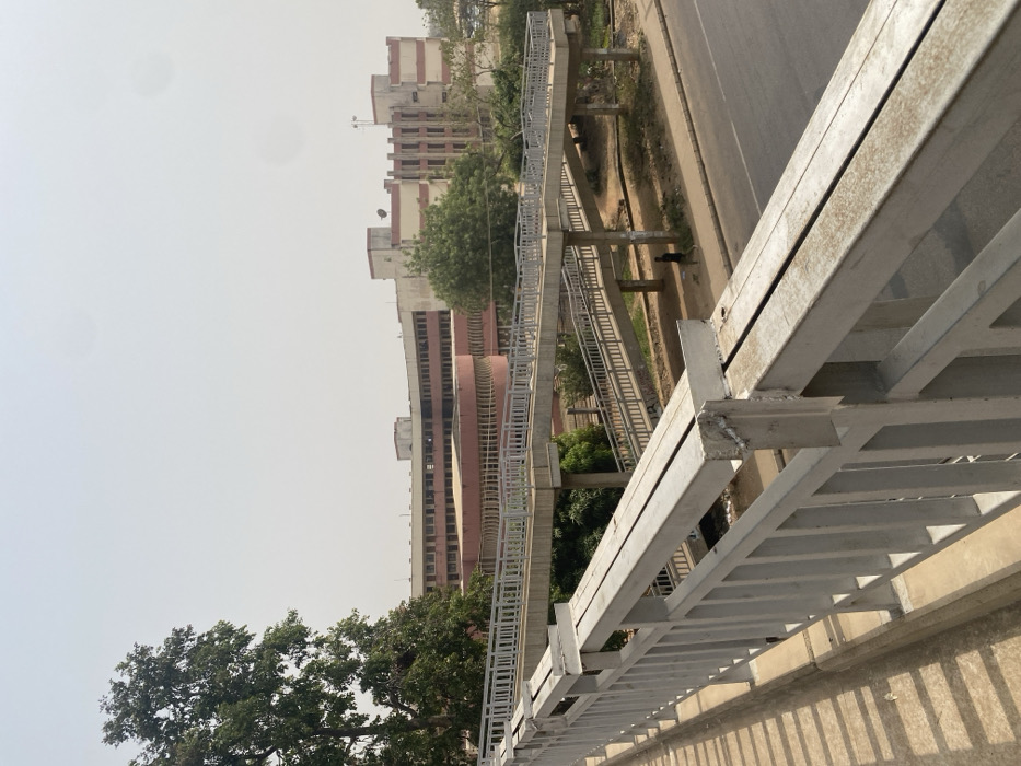 An elevated, daylight scene in Unguwan Dosa, Nigeria, depicts an urban landscape. In the foreground, a silver-painted metal pedestrian railing partially obstructs the lower right quadrant. The midground features a multi-segment concrete pedestrian overpass with several ramps and landings, equipped with silver railings, spanning across an asphalt road. A single individual, a male dressed in dark clothing, walks southwestward on the unpaved shoulder adjacent to the road. In the background, a large institutional building complex dominates, characterized by a prominent semicircular section with reddish-brown cladding and numerous windows, connected to multi-story, rectilinear structures featuring light-colored facades with reddish trim. Several trees with green foliage are visible, interspersed among the buildings and alongside the road. The sky is a pale, hazy white, indicating bright ambient light.