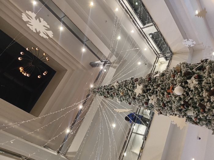A low-angle shot showcases a tall Christmas tree adorned with ornaments and fairy lights, extending from the base upwards, with a man in blue visible. Above, a snowflake decoration and a modern chandelier contrast with the festive scene. The architecture incorporates a high ceiling with multiple layers and visible skylights, creating a sense of spaciousness and height. The lighting is bright, highlighting the details of the decorations and the building's design.