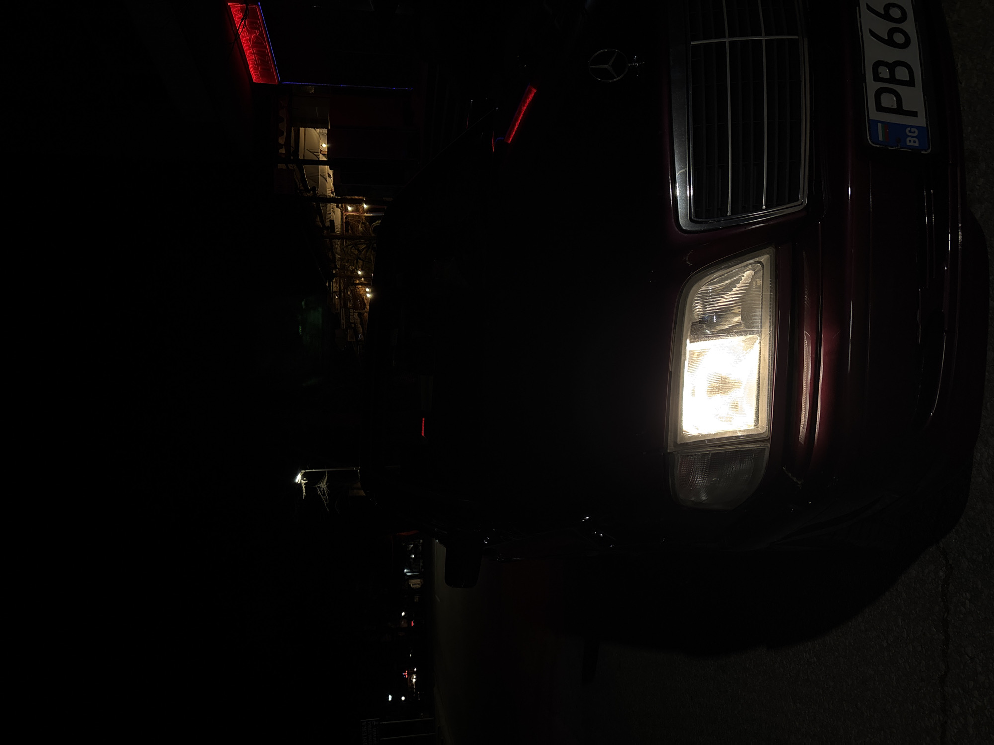 At night in Hisarya, Bulgaria, the front right of a burgundy Mercedes is illuminated by its headlight. The vehicle is parked in front of an establishment featuring a red neon sign and string lights. The license plate reads "PB 66".