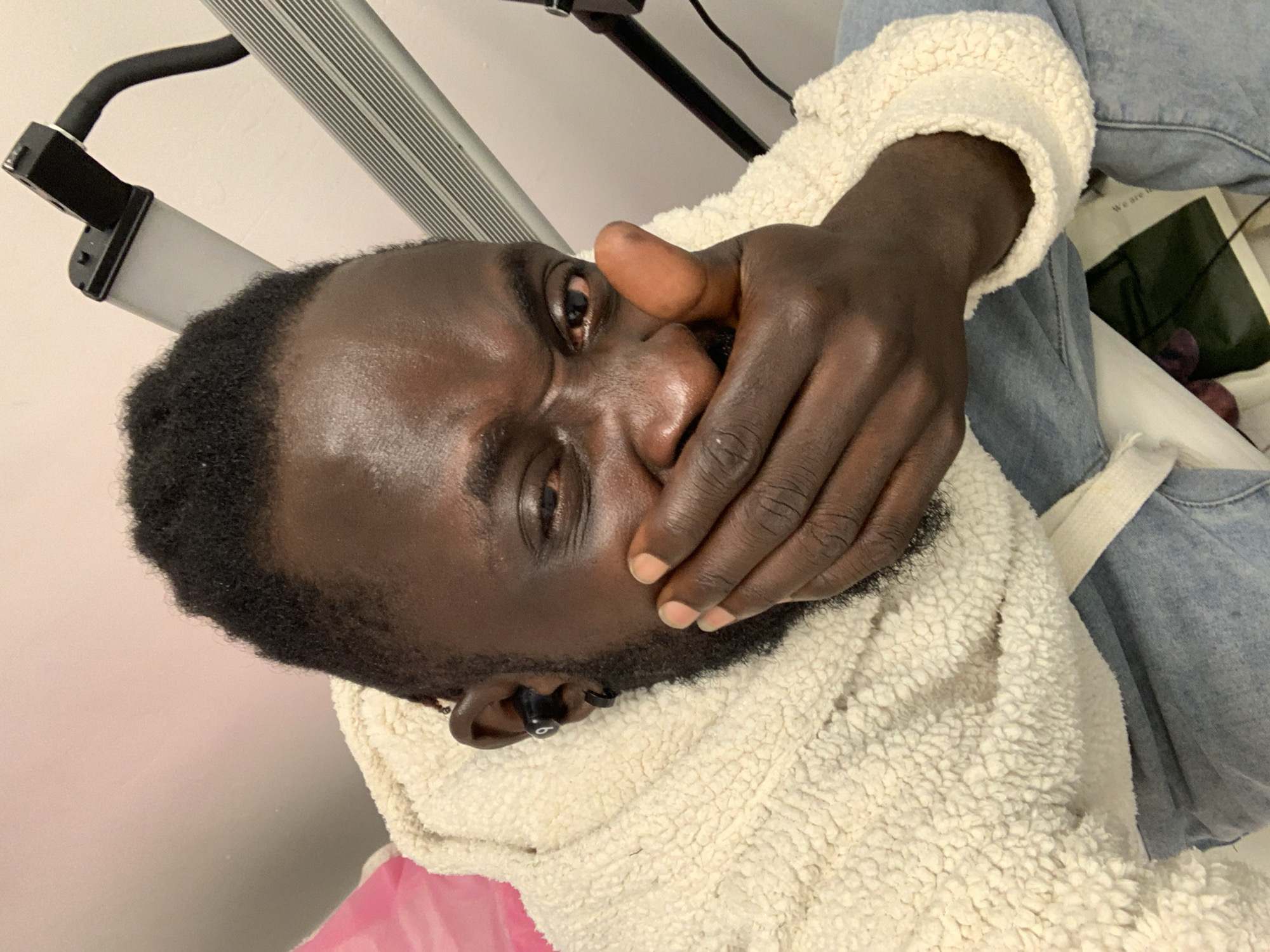 The image displays a close-up, chest-up view of a single adult male within an indoor environment. The specific location in Lekki, Nigeria, cannot be determined from the visual information provided. The subject is a male with a dark complexion, short, dark, textured hair, and a beard. He is wearing an off-white, textured fleece jacket and light blue denim trousers. A black wireless earbud is present in his left ear, alongside a small black hoop earring. His right hand is positioned over his mouth, with the thumb extended upwards towards the camera. His facial expression includes a wide-open right eye and a partially closed or squinted left eye, indicating a gesture consistent with suppressed amusement or mischief. In the background, to the upper left, a plain light pink surface is visible. To the upper right, a professional lighting apparatus is present, featuring a silver-colored stand or tripod supporting a rectangular light fixture with a translucent white panel and a black top housing. Partially visible below the man's arm and leg are several sheets of paper or a magazine with legible text "We are" and an obscured image fragment. The scene is evenly lit.