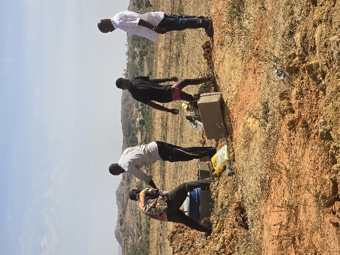 The image captures an outdoor scene in an undeveloped area near DU, Nigeria. The environment consists of reddish-brown soil, dry sparse vegetation, and visible mounds of excavated earth. In the background, arid, undulating terrain with distant hills is present under a hazy, light blue sky. Four adult males are visible. The leftmost man, wearing a patterned short-sleeved shirt and dark trousers, is bent over near a partially visible blue barrel or container within a disturbed patch of ground. Adjacent to him, a second man in a white collared shirt and dark trousers is also bent, appearing to interact with the leftmost man. The third man, positioned centrally, wears a black t-shirt and pink shorts, standing over a cluster of gray concrete blocks and loose soil. The fourth man, on the far right, wears a white short-sleeved collared shirt and blue jeans, standing upright and observing the scene. Visible objects on the ground include multiple gray hollow-core concrete blocks, a yellow sack, and general debris, indicating recent or ongoing manual work involving excavation and construction materials.
