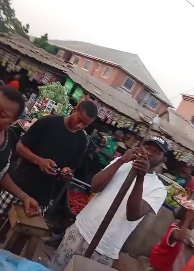 busy market scene. People are gathered around stalls selling various goods, including fish, vegetables, and packaged food items. Many people are walking and shopping. Some children are present, some wearing sports jerseys. The buildings behind the stalls appear to be residential. The lighting suggests it is daytime, but the sky is overcast.