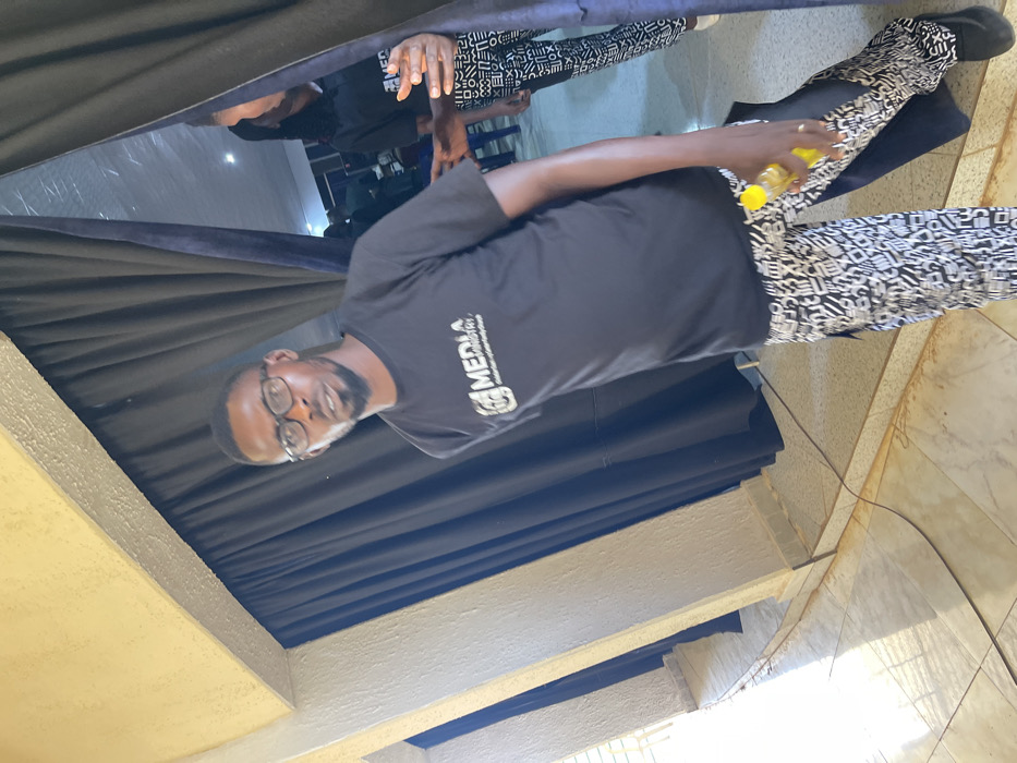 This image depicts a scene in Kufena, Nigeria. A male individual stands prominently in the foreground, facing the camera with a direct gaze. He has a dark complexion, short dark hair, and wears clear-rimmed eyeglasses and a slight beard. He is dressed in a black short-sleeved t-shirt with a white logo and text on the chest that reads "MEDIA MINISTRIES" and "GLORY OF GOD'S CHURCH" (partially visible). He wears black and white patterned trousers featuring abstract geometric or letter-like designs. In his right hand, he holds a small, translucent yellow bottle. Behind and to the right of the primary subject, another individual is partially visible, emerging from behind a dark, heavy curtain that serves as a partition or doorway. This second person also appears to be wearing a black t-shirt with the "MEDIA" logo and black and white patterned trousers, indicating a similar attire. The setting includes a light-colored tiled floor with visible grout lines in the foreground and to the left. A light-colored, possibly stuccoed, structural column or wall is present on the left side of the frame. Through the opening in the dark curtain, a glimpse into an interior space reveals blurred figures and what appears to be a brightly lit room. The overall lighting is bright, illuminating the subjects and immediate environment.
