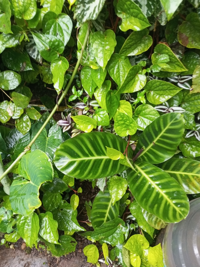 A vibrant, close-up shot showcases a lush collection of plants. Predominantly featuring glossy, heart-shaped leaves, there's also a zebra plant with striking striped foliage in the lower-right quadrant. A thin vine climbs vertically through the scene. The plants are wet, suggesting recent rain, enhancing the verdant hues of the diverse greenery. The ground is partially visible at the bottom left.