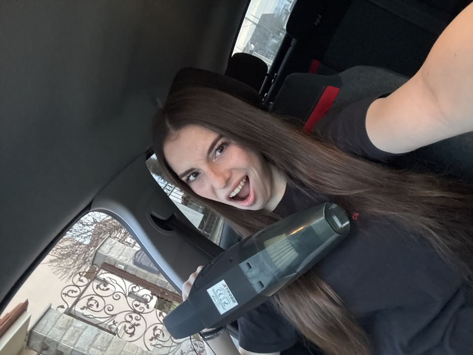 The image depicts a female individual taking a selfie from inside a car, located in what appears to be a residential area of Trud, Bulgaria. The subject, a female with long, straight, dark brown hair and visible freckles on her nose and cheeks, is positioned in the foreground. She is wearing a black short-sleeved t-shirt, with faint red lettering ("CK") visible on the chest. Her mouth is open in an expression of surprise or excitement, and she is looking directly at the camera. In her right hand, she holds a dark gray/black handheld cordless vacuum cleaner, oriented with its underside facing the camera. Visible markings on the vacuum include "ATROBB," CE certification, and a crossed-out wheelie bin symbol. The transparent dust collection chamber and internal filter are visible on the device. The interior of the vehicle shows a gray headliner and A-pillar on the left. A car seat, likely the front passenger seat, is visible behind the individual to the right, featuring black upholstery with red stitching or accents. Through the car's windows, an outdoor environment is visible. To the left, a large, ornate black wrought-iron gate, characteristic of a property entrance, is partially visible. Behind the gate, a light-colored building wall and bare tree branches against a bright sky are observed. The overall background suggests a residential setting under daylight conditions.