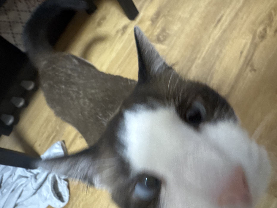 The image displays a domestic cat in a very close-up, low-angle perspective, looking directly at the camera. The cat features a predominantly white face with a prominent pink nose and light blue eyes. Dark fur, appearing black or dark brown, frames its face, covers its ears, and extends over its visible body and tail. A white patch is visible on its forehead. The cat is situated indoors on a light-toned wooden floor, consistent with laminate or parquet. In the background, to the upper left, a crumpled light grey textile object is visible. A dark, indistinct furniture element, possibly a chair leg or base, is partially visible in the upper right quadrant. No identifiable exterior or interior architectural features are present to determine a specific location within the city of Sofia, Bulgaria.