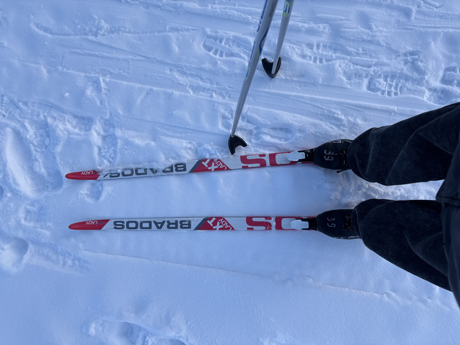 A first-person perspective depicts a skier standing in fresh snow, wearing black boots labeled with the number "39." The skier is equipped with white and red cross-country skis branded "BRADOS Lady XT SC." Silver ski poles are planted in the snow nearby. The ground is covered with an undisturbed layer of snow, showcasing some footprints and ski tracks.