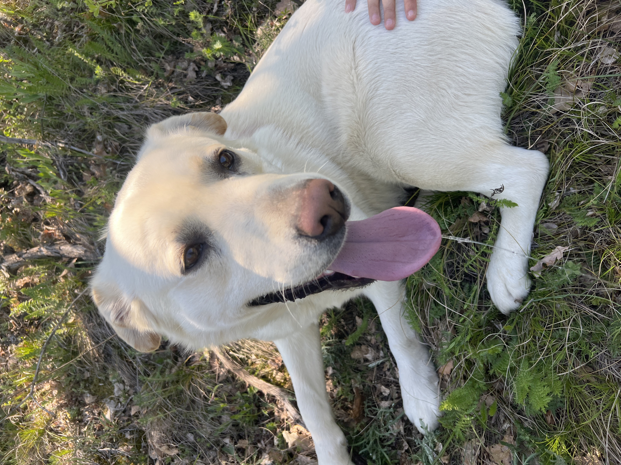 A close-up, ground-level, outdoor shot depicts a light-colored Labrador Retriever lying on grass and dry leaves. The dog is panting with its tongue extended, facing the camera. A human hand is gently placed on the dog's back. The location is Markovo, Bulgaria.