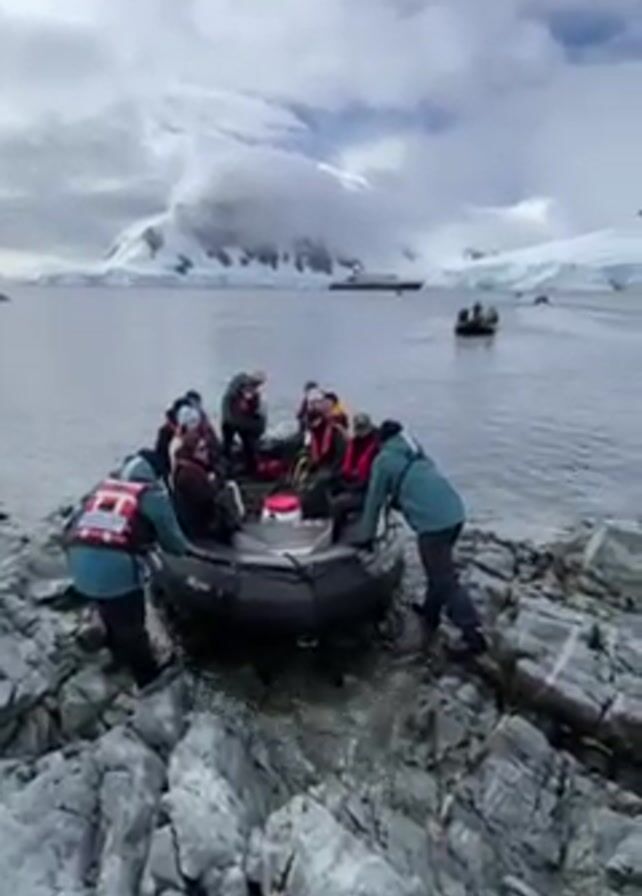 A group of people in an inflatable boat are being assisted onto a rocky shoreline. The rocky shore is composed of large, gray rocks. Some of the people in the boat are wearing bright red life jackets. Two people, presumably guides, are helping to pull the boat onto the rocks. In the background, there's a view of a body of water with snow-covered mountains and glaciers in the distance under a partly cloudy sky. Another similar boat is seen moving across the water in the background. The camera pans slightly to the right, showing more of the rocky landscape and the water and mountains in the distance.