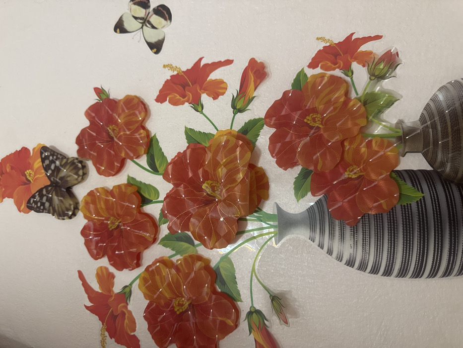 The image displays a wall decorated with a vibrant floral and butterfly motif, located in Ado, Nigeria. The decoration consists of both printed graphic elements and three-dimensional, layered decals affixed to a textured white wall. The central focus is a bouquet of hibiscus-style flowers in various shades of orange and red, some featuring a layered construction with visible internal mesh-like patterns and subtle glitter accents, giving them a raised appearance. Green stems and leaves connect these flowers, originating from two stylized vases printed at the bottom of the scene. The larger vase on the left is tall with a narrow neck and horizontal black and white stripes, while the smaller vase on the right is shorter, wider, and displays a brown striped pattern. Two butterfly decals are present: one at the top center, a 3D-effect brown and black patterned butterfly positioned over a flower, and another flatter, white and black butterfly decal on the mid-right. No people, discernible actions, or overt interactions are depicted. The lighting is uniform, illuminating the textured white background.