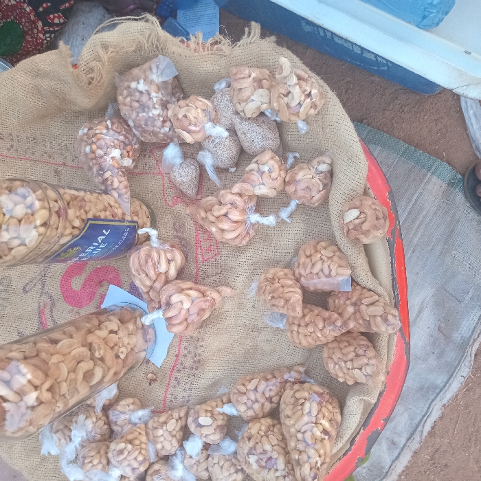 The image captures a close-up, high-angle view of a market stall, presumably in Kakuri Gwari, Nigeria. Various packaged nuts and seeds are displayed on a coarse, light brown burlap sack, which rests on a circular, red-rimmed tray or surface. The display includes: 1. **Peanuts:** Numerous small, clear plastic bags, each tied with white string, containing shelled peanuts. These bags are primarily arranged on the left and lower-center of the display. 2. **Cashew Nuts:** Several larger clear plastic bags, also tied, containing cashew nuts, scattered across the central and right portions. Additionally, two tall, clear glass jars are filled with cashew nuts; the jar on the right has a blue label partially visible, reading "IMPERIAL BLUE." 3. **Seeds:** A cluster of smaller clear plastic bags, tied with white string, containing white sesame seeds or similar small grains, located on the right side of the display. The burlap sack beneath the items shows faint red lettering, including a partial "S" near the top-center. The immediate ground surface visible below the display is a sandy or dirt-like texture, partially covered by a striped mat. A dark-colored sandal is partially visible at the bottom-center, suggesting the presence of a person.