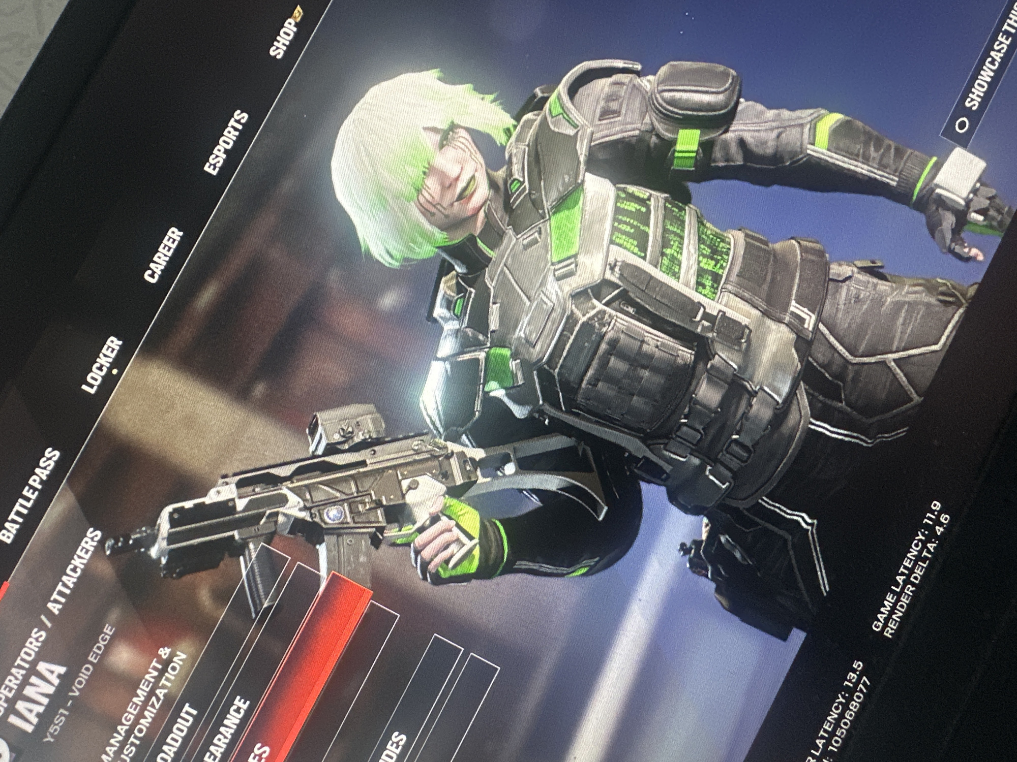 screenshot of a video game menu, likely from "Rainbow Six Siege". The operator "Iana" is featured prominently, showcasing a skin with white hair streaked with green, a black tactical vest with green accents, and a weapon with a red dot sight. The menu options visible include "Battle Pass", "Locker", "Career", "Esports", and "Shop". The text "IANA Y5S1-VOID EDGE" is also visible, indicating the operator and associated season. The image also displays game latency statistics: GAME LATENCY: 11.9 and RENDER DELTA: 4.6. The location is not identifiable as Sofia, Bulgaria.
