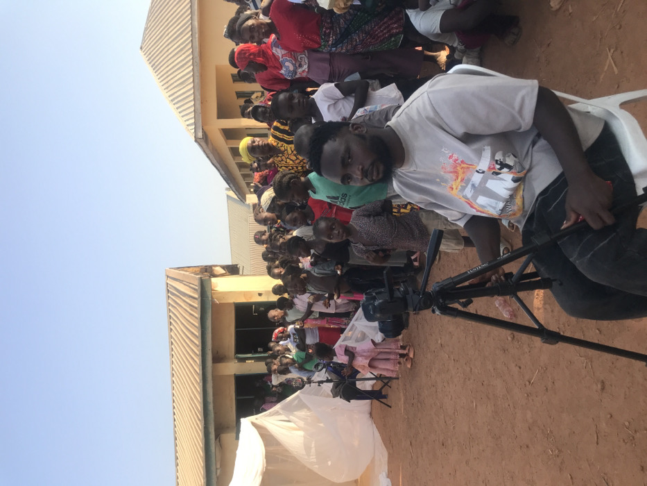 A man sits adjusting a camera on a tripod in front of a large group of people, appearing to be an audience. The crowd consists of adults and children of varying ages. Some are standing, while others are seated on chairs. Behind the group is a one-story building with a light-colored exterior and a corrugated metal roof. A white sheet or tent-like structure is visible at the front of the crowd. The ground is reddish-brown, possibly dirt or sand. The sky is clear and blue.