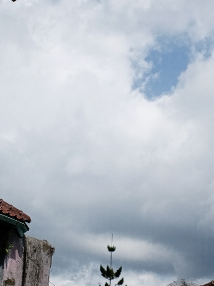 An overcast sky dominates the scene, filled with swirling gray and white clouds. A patch of blue sky peeks through the cloud cover in the upper right. Below, the edge of a building with a red-tiled roof is visible on the left. A tall, slender tree stands in the lower center, reaching towards the sky. The building and tree are situated against the backdrop of the turbulent clouds.