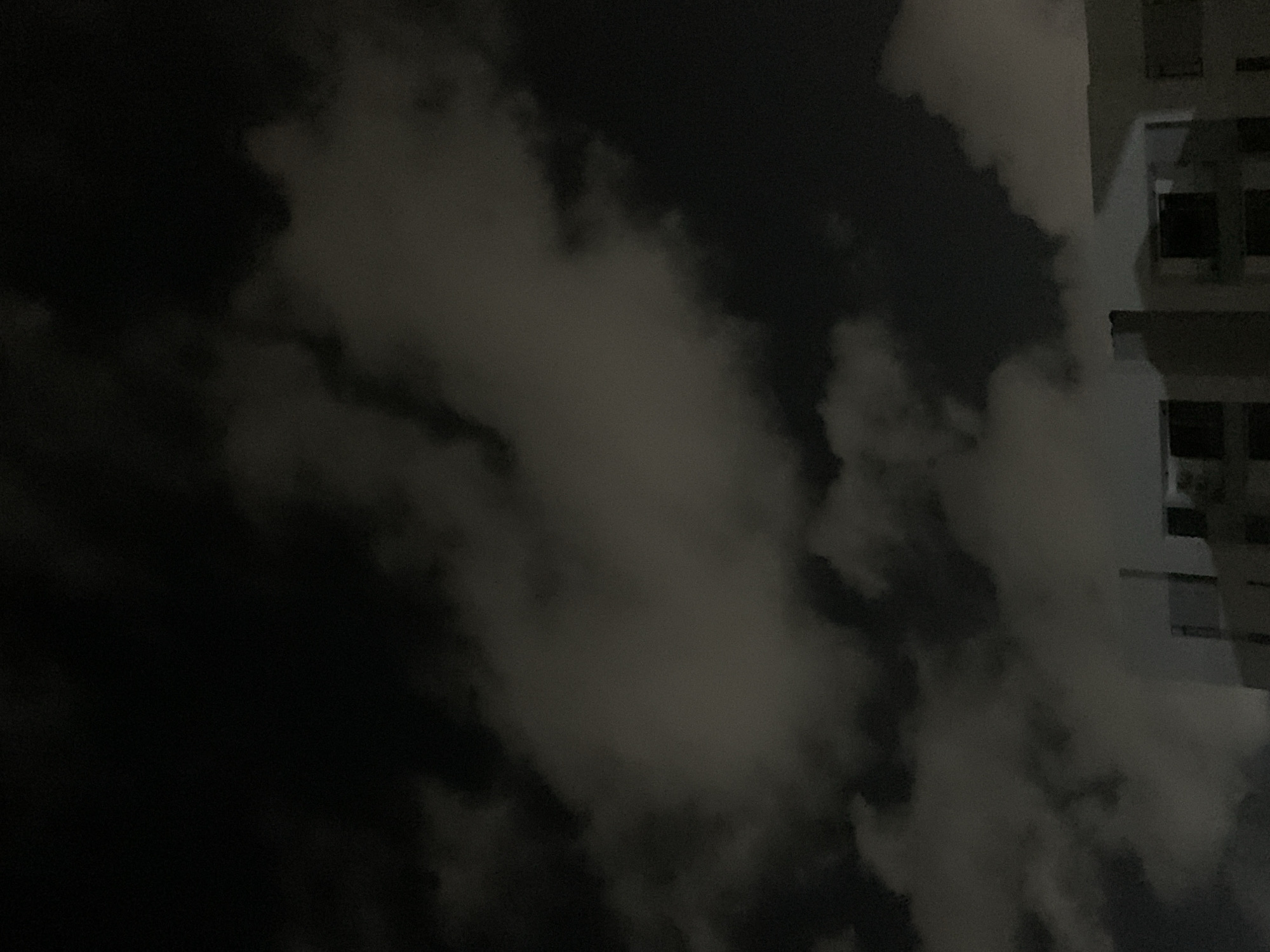 The image captures a nighttime scene in Moba, Nigeria. The upper two-thirds of the frame are dominated by a dark sky filled with dense, variably lit grey clouds. The clouds appear to be illuminated from below by an unseen light source. The lower third of the image reveals the upper portions of multiple low-rise buildings, characterized by light-colored facades and dark, rectangular window or roof openings. A singular, vertical, chimney-like structure is visible extending upwards from one of the buildings on the left side of the frame. No individuals, subjects, actions, or interactions are present.