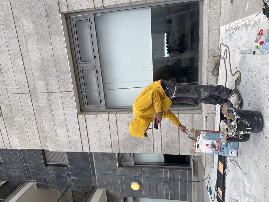 The scene depicts an outdoor ground-level area adjacent to a modern multi-story building in Tirat HaCarmel, Israel. The building features two distinct facades: the left side comprises dark grey horizontally-laid rectangular tiles with a balcony and a circular yellow wall-mounted light fixture, while the right side is constructed of lighter grey horizontally-laid rectangular tiles with large, dark-framed windows. A single individual, a male, is present, wearing a bright yellow hooded sweatshirt, dark, paint-splattered work pants, and light-colored work boots. His hood is up, partially obscuring his face, though a dark cap is visible underneath. He is bent forward, actively scooping material from an open white and blue bag, labeled in Hebrew with "Nirlat Acrylic Plaster" and "25 kg", using a flat trowel held in his right hand. In his left hand, he holds a dark electronic device, possibly a mobile phone. On the concrete ground around the individual are two black plastic buckets containing various tools and residual materials, a coiled rope, and scattered fragments of dried plaster or construction debris. In the lower right foreground, a plastic water bottle, a smaller white plastic bottle, and a red plastic bag are discarded. Two ropes descend from the upper sections of the building: a blue rope along the darker facade on the left, and a thinner, dark rope along the lighter facade, passing behind the individual. The large window on the right facade reflects a partial interior view, including a light-colored roller blind, and a blurred exterior reflection of what appears to be a street or parking area with vehicles.