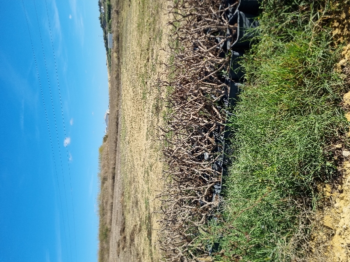 The scene depicts an outdoor landscape under a clear blue sky, with a single white cloud and three overhead power lines. The specific location within Unknown, Unknown cannot be determined from the image. The foreground features dry, light brown soil partially covered by patches of green grass and weeds. Immediately behind this, a dense linear arrangement of numerous dark-colored plastic pots contains dormant, woody plants characterized by intricate, gnarled brown branches. Beyond the potted plants, an expansive, mostly barren field with light brown and tan soil and sparse, dry vegetation extends into the midground. The distant background reveals gently rolling terrain with scattered green foliage and several white-colored buildings. No individuals or active subjects are present.