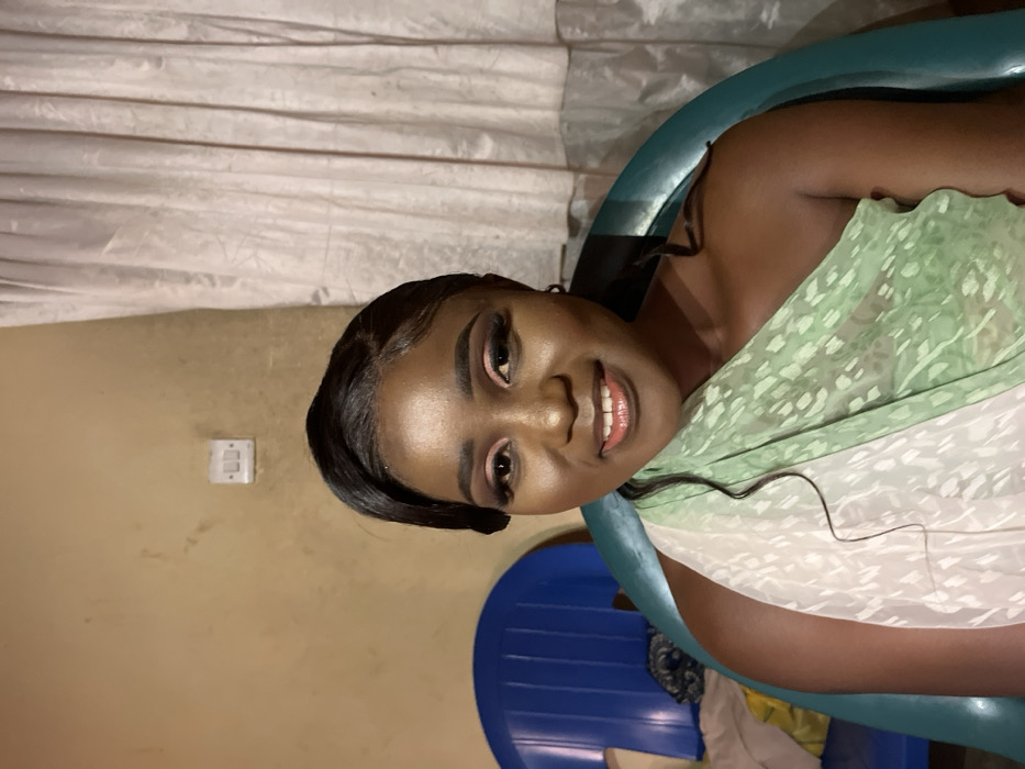 single adult female subject seated indoors in Kuru Dungus, Nigeria. The subject, with dark skin, faces slightly right of center, exhibiting a smiling expression with her mouth slightly open, revealing her teeth. She has prominent eye makeup, including pink eyeshadow and dark eyelashes, and her lips are glossy. Her dark hair is styled, with a portion swept over her forehead. She wears a one-shoulder garment, featuring a light green, subtly patterned fabric on the right side, and a plain light-colored fabric on the left. She is seated in a dark teal or green plastic chair, visible on the right side of the frame. To the left, a portion of a blue plastic chair is visible. The background consists of a light brown wall with visible discolorations, featuring a white dual-toggle light switch mounted above and to the left of the subject. Light-colored fabric curtains are visible on the right side of the background. The scene is illuminated by indoor artificial light.