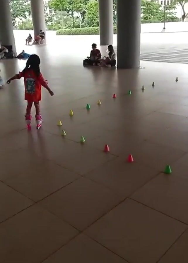 A young girl is roller skating through a line of small cones of various colors on a tiled surface. She is wearing a red shirt, a backpack, and pink roller skates. Several people are sitting near a pillar in the background, watching her. Outside, there is greenery and a building.