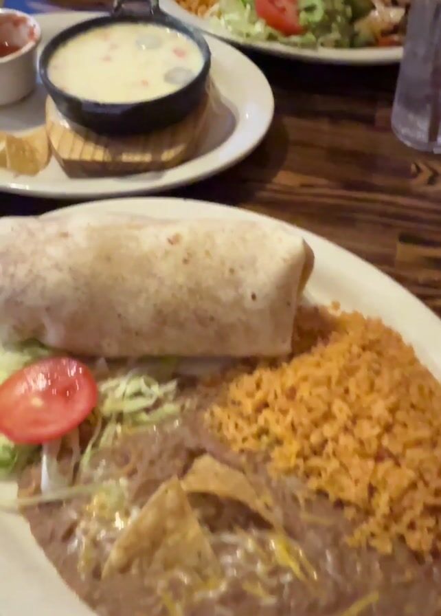 table set for a meal at a restaurant. On the table are several plates of food. One plate holds a large burrito with a side of rice and refried beans topped with cheese and tortilla chips. Another plate has a small cast-iron pot filled with a creamy queso dip, accompanied by tortilla chips and a small container of salsa. In the background, another plate features what appears to be fajitas with rice and a salad garnish. A glass of ice water is also visible. The table is made of wood and appears to be inside a restaurant. The lighting is typical of an indoor dining setting.