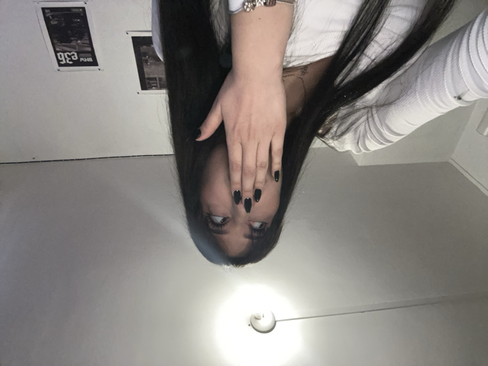 A woman with long, dark hair covers part of her face with a hand adorned with black nail polish. She wears a white, long-sleeved shirt. Behind her, there are two framed pictures hanging on a white wall, one appearing to be a BMW advertisement. The photo is taken from a low angle, making her appear to be upside down. A simple light fixture is visible on the ceiling.