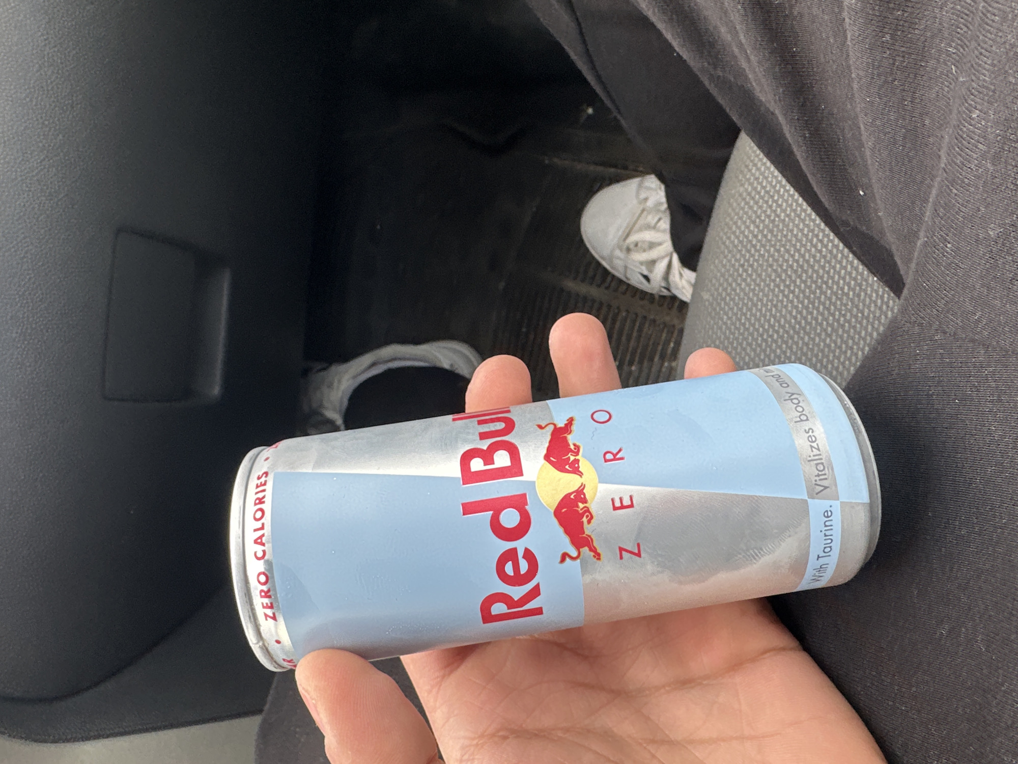 A Red Bull Zero energy drink can is held in a person's left hand inside a vehicle. The can is silver and light blue, prominently displaying "Red Bull ZERO" in red lettering and "ZERO CALORIES" at the top. The phrase "With Taurine. Vitalizes body and" is partially visible near the bottom. The background reveals the dark interior of a vehicle, including a black dashboard or glove compartment area, a dark floor mat, and a gray fabric car seat. A person's leg, clad in dark trousers, is visible on the lower right, with a white athletic shoe on the floor. A second shoe is partially visible on the far left. The location is an unspecified vehicle interior in the city of Unknown, Unknown.