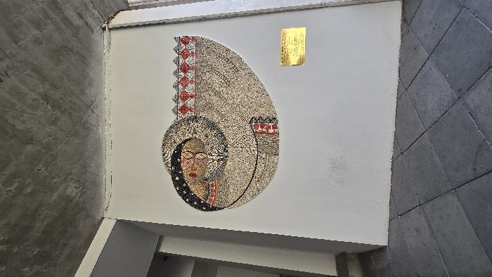 The image displays a large, semi-circular mosaic art piece affixed to a light-colored wall within a building in Stara Zagora, Bulgaria