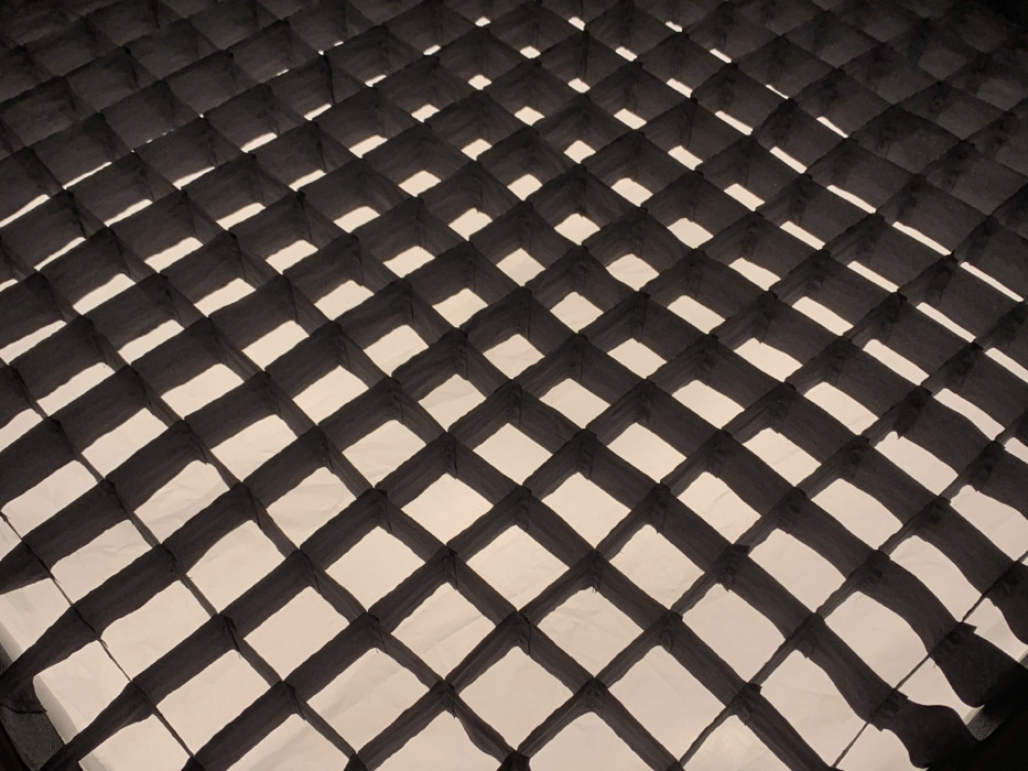 An overhead shot reveals a grid-like structure, appearing as a black lattice against a white backdrop. The black lines form numerous squares, creating a repeating pattern across the frame. Shadows and light variations provide depth, accentuating the geometric design. The effect is somewhat distorted, with the squares subtly changing shape due to the angle.