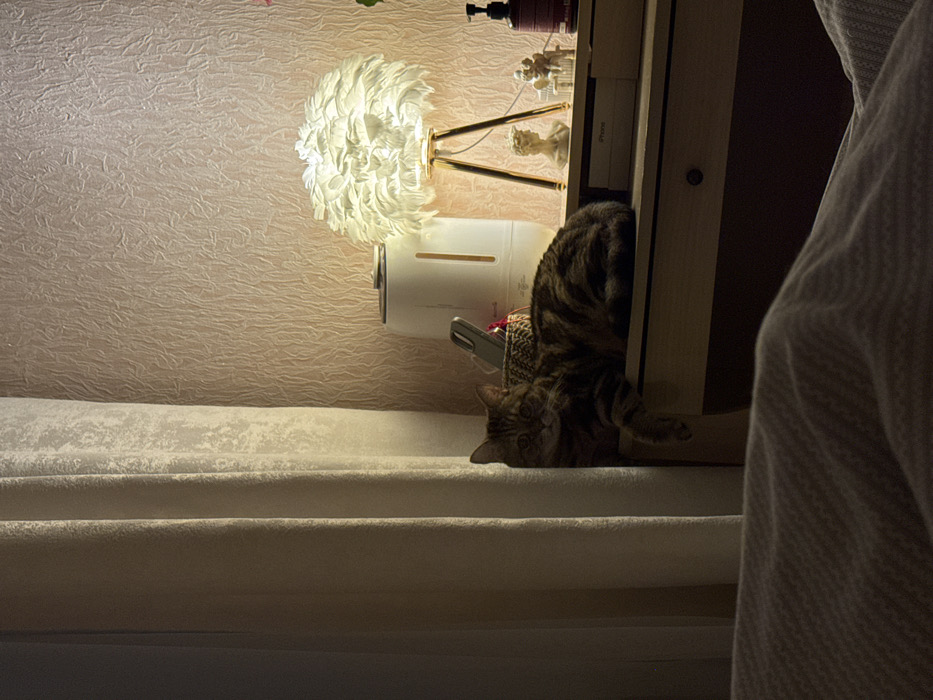 A cat, predominantly grey and brown in color, lies on a light-colored, textured surface. The cat's head is near the edge of the surface, and its body extends towards an adjacent wooden structure. A decorative lamp with a feather-like shade stands nearby. The wall behind the lamp is a pale shade with a textured pattern. A partially visible draped fabric in a light hue is situated to the right.