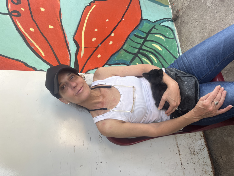 An adult female is seated outdoors in Quilmes Oeste, Argentina, against a backdrop of a light-colored wall and a vibrant mural