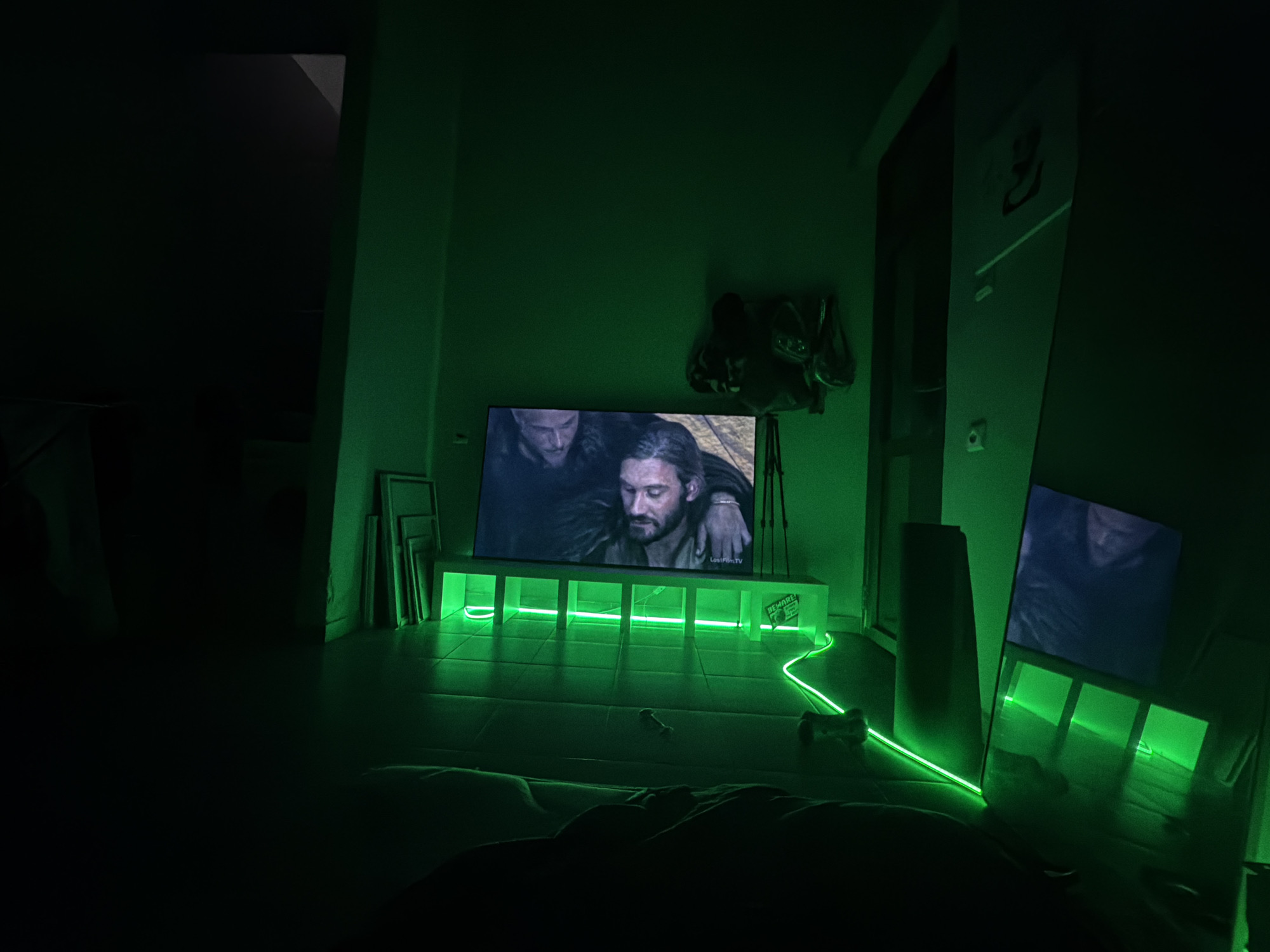 A dimly lit room with green lighting features a television displaying a video of two men. The TV is set on a white stand, also illuminated in green. To the right, a second television screen is visible, partially obscured and reflecting the green light. Various objects are scattered on the floor near the television stand, including what appears to be a dog toy and a gaming console controller. In the background, a black bag hangs on the wall. The origin or location of this image within the city of Haifa, Israel, is not discernible from the presented image.