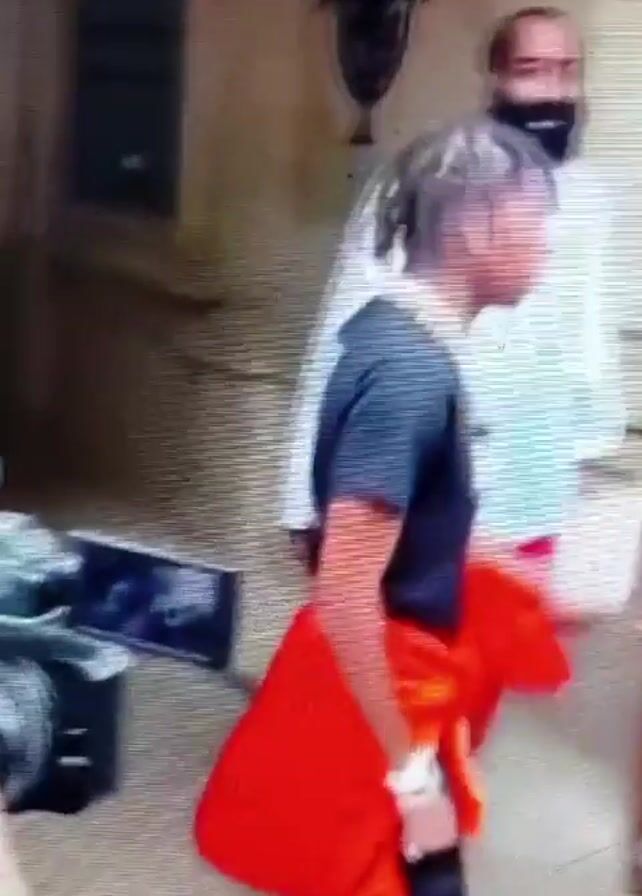 Two men are walking, with the man in the front wearing a black t-shirt, a large diamond chain, and a red garment draped over his right arm