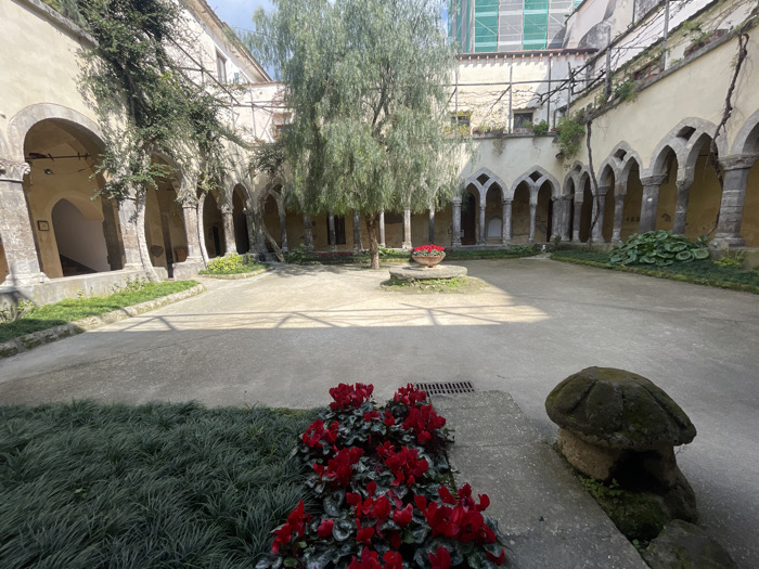This image depicts the interior courtyard of the Chiostro di San Francesco (Cloister of San Francesco) in Sorrento, Italy