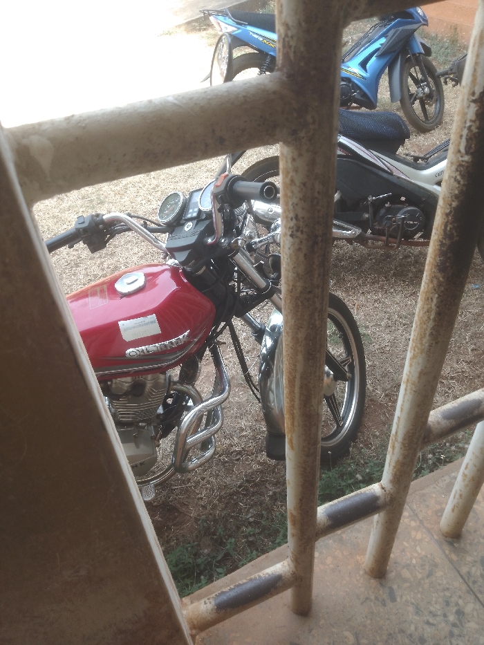 The image displays an outdoor parking area within the city of Unknown, Unknown, viewed through rusty, off-white metal railings originating from a speckled tiled surface in the immediate foreground. Three motorcycles are parked on reddish-brown, unpaved ground sparsely covered with dry vegetation. The prominent vehicle in the midground is a red 'CHENHNA' motorcycle, parked facing right, featuring a chrome handlebar, speedometer, fuel tank, exposed engine with a chrome crash bar, and black spoked wheels. Behind it, a light-colored scooter with blue accents and a blue motorcycle are also parked, generally facing right. No individuals are present in the scene.