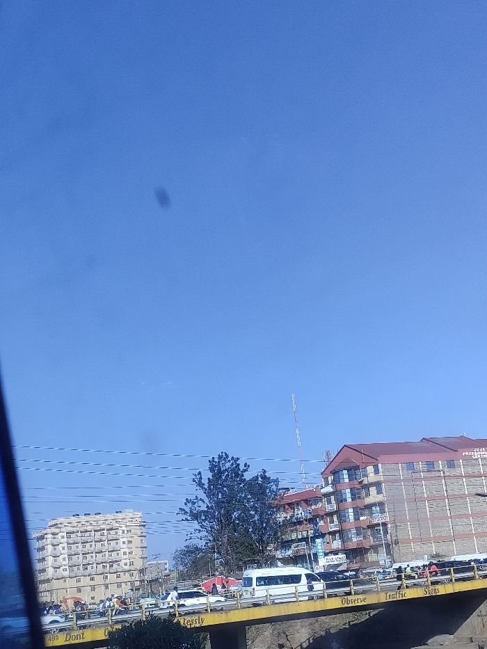 A view of city buildings under a clear, blue sky. A tall apartment building stands in the background to the left, while another building is situated to the right. A thin radio tower is visible. A yellow bridge with the words "Observe Traffic Signs" stretches across the foreground with cars driving across it.