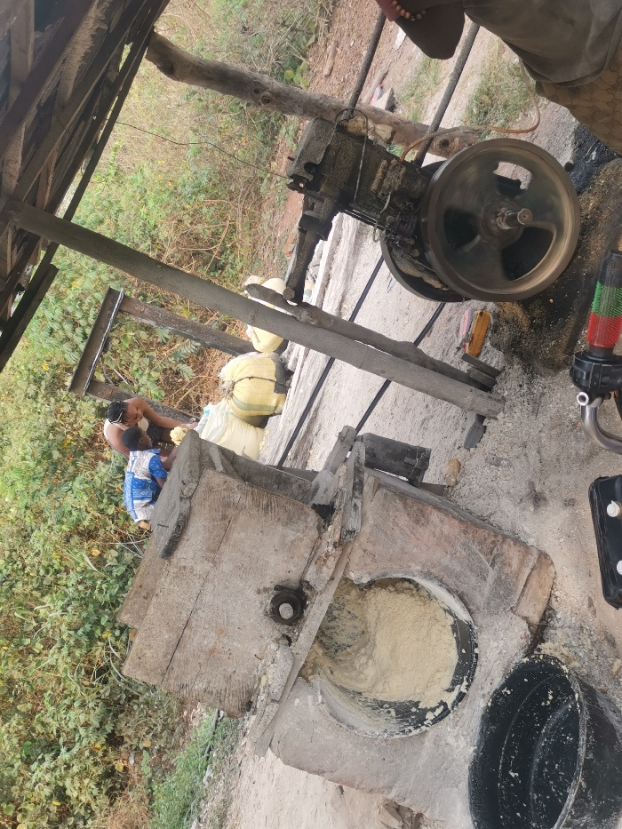 A machine is grinding a light-colored powder, with two people nearby. One person sits next to a large, wooden structure where the machine grinds the powder. There are also bags of material, possibly ingredients, stacked in the background. The surrounding area has lush green vegetation, and a makeshift structure provides shelter over the grinding process. A black bucket sits nearby, presumably used for collecting the processed material.