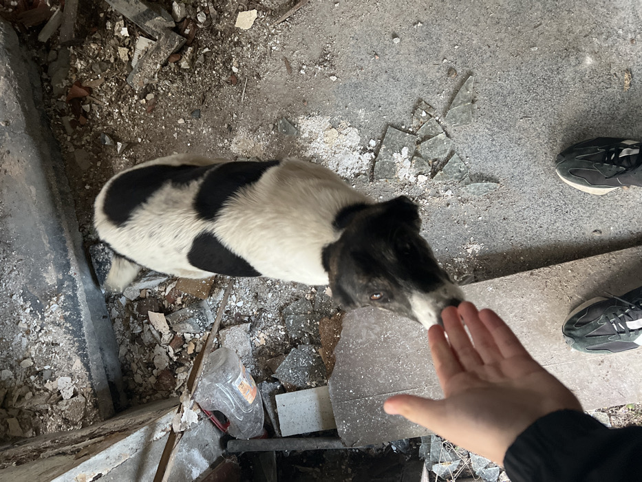 - "An overhead view within a derelict interior in Ardino, Bulgaria, shows a black and white dog interacting with a human" by FM-yFnm82, licensed under CC BY 4.0