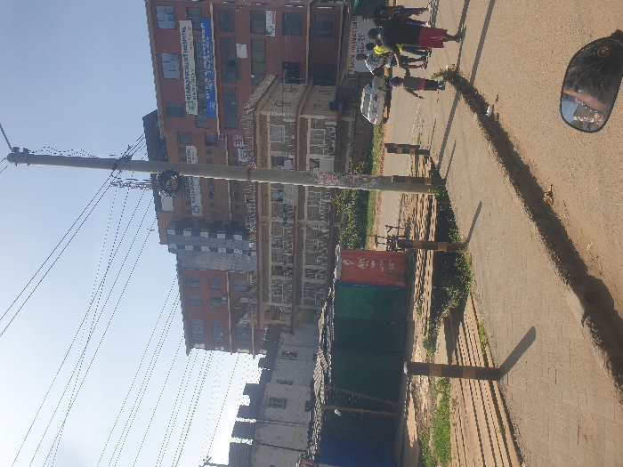 A street scene features a cluster of buildings, including Plaza Specialist Hospital. A utility pole with numerous wires stands prominently. Several people walk along the road's edge, near trash bins. The scene is captured from a high angle, possibly from a vehicle, as indicated by a side mirror visible in the right corner. The road shows signs of wear, and the overall lighting suggests a bright, sunny day.