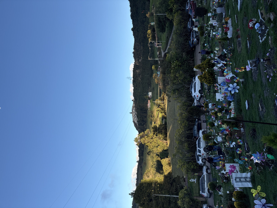 The image displays a cemetery or memorial park in Casco Urbano, Colombia