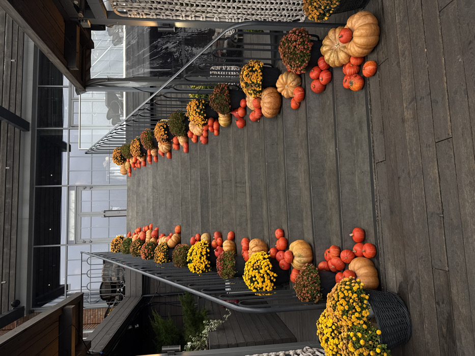 The image depicts an outdoor staircase decorated with autumnal elements, likely in the city of Odesa, Ukraine. A wide, dark grey staircase, approximately 20 steps deep, ascends towards a modern building entrance featuring large glass double doors and extensive glass panels. The stairs are flanked on both sides by dark metal railings. Along the outer edges of each stair, numerous pumpkins and potted flowering plants are arranged in a continuous, dense line from the bottom to the top. The pumpkins vary in size from small to medium, displaying shades of bright orange and lighter tan/cream. Interspersed with the pumpkins are dark-colored pots containing dense clusters of small chrysanthemum-like flowers, predominantly bright yellow and reddish-brown/deep orange. The ground surface at the base of the stairs consists of dark wooden decking. To the left, a multi-tiered structure with a dark wooden exterior and some green foliage is visible. The building at the top of the stairs appears to have an upper floor or roof structure with dark wooden slats. The reflective glass of the building's entrance shows faint interior details, possibly including tables or chairs. No individuals are present in the scene. The overall environment suggests a decorative display for a commercial or public building entrance during the autumn season.