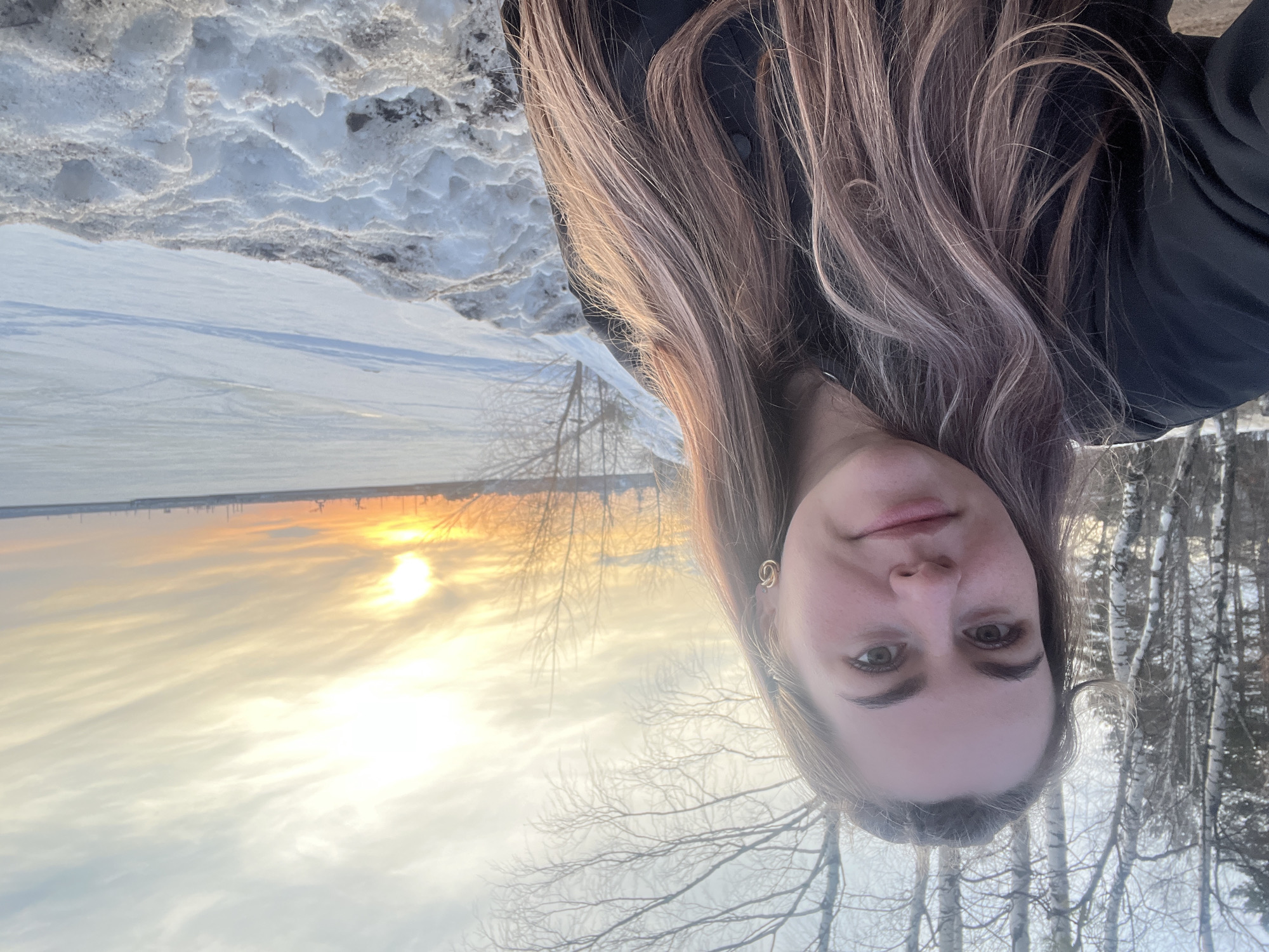 An adult female is depicted in a selfie-style shot outdoors in Chaikovsky, Russia, during what appears to be a sunset or sunrise. She occupies the left and central portions of the frame, looking directly at the camera with a neutral expression and a slight smile. She has long, light brown hair with subtle reddish highlights, worn down, and wears a dark jacket along with gold-colored hoop earrings. To her left, in the background, stands a cluster of leafless trees, predominantly birch, suggesting a winter or early spring season. To her right, stretching into the distance, is a vast, snow-covered, frozen body of water, likely the Votkinsk Reservoir on the Kama River. The sky above the frozen water displays a vivid sunset with a bright, low sun casting warm orange and yellow light across a cloudy horizon. Distant industrial structures or cranes are visible as dark silhouettes against the glowing sky on the far side of the water. In the foreground to her right, mounds of dirty snow are present.