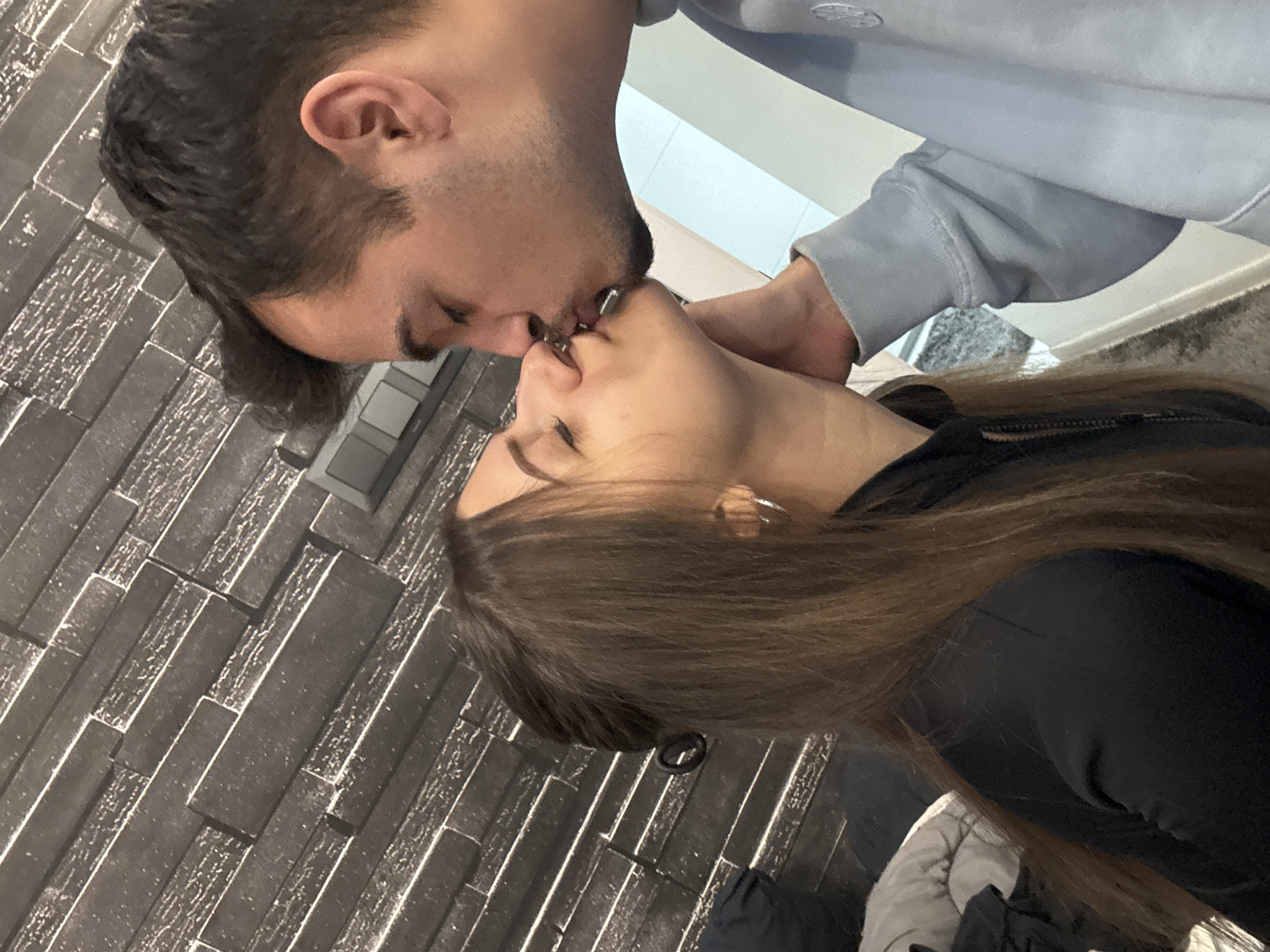 A close-up, angled shot depicts a man and a woman kissing indoors. The man has dark hair and a short beard; he's wearing a light blue sweatshirt. The woman has long brown hair and is wearing a black jacket. The background includes a dark gray brick wall and glimpses of a white surface, possibly a floor or countertop. The location is not identifiable from the image. The primary action is the couple kissing.
